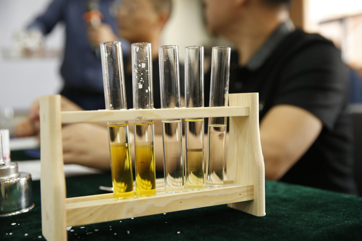 △從左到右依次為日月酒窖醬酒、日月酒窖濃香酒、其他品牌競品酒,顏色越深顯示糧食含量越高