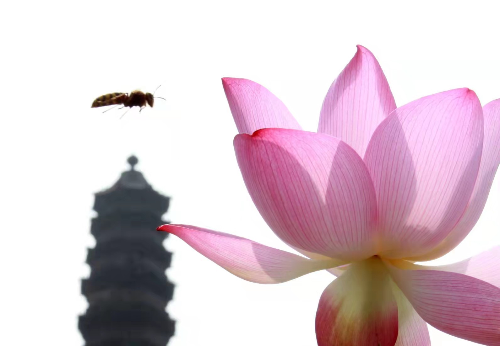 輕松愉悅的攝影分享會從一組充滿靈氣的照片展示開始。有時候0.001秒的抓拍就能造就奇妙效果,因為一個小小蜜蜂的光顧,盧老師拍攝出了有趣的“蜜蜂、荷花、開封鐵塔”。