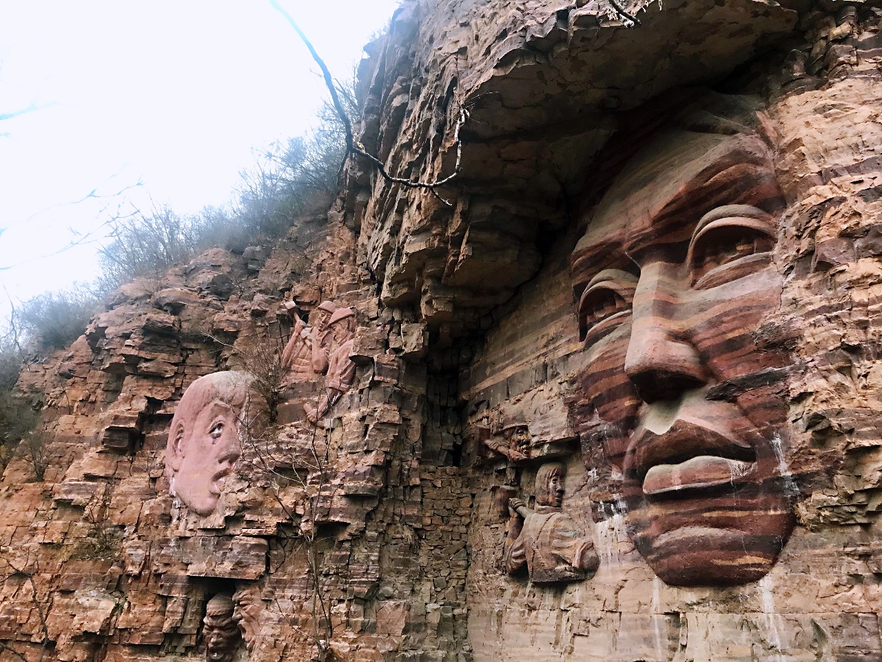 兩邊的巖壁上到處都有炮藥燒撩過的痕跡,還有不少堅實的雕塑,有的吹著號角,有的張著大嘴像是在吶喊,足以讓人想象那些年,林縣人在食不果腹的情況下,扁挑手抬修建紅旗旗的艱辛。