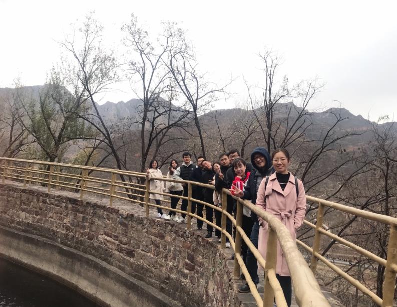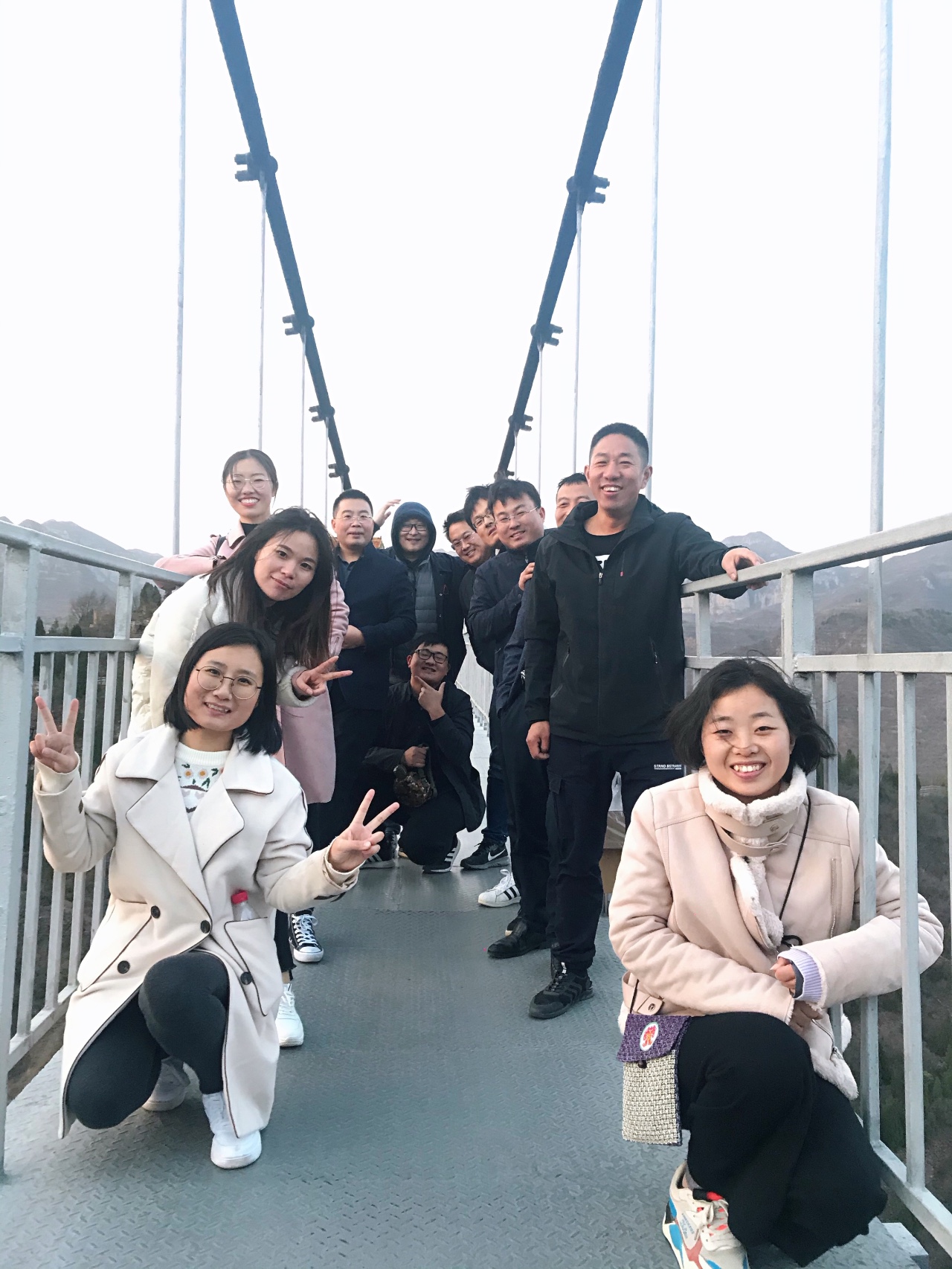 一同事聲明,有恐高癥,就不過去了,但看到大家都走了過去,她還是壯了壯膽,勇敢的突破自我跟了上去。到達橋的對面時,大家一起為她歡呼雀躍,并激動地回到橋中央合影留念。