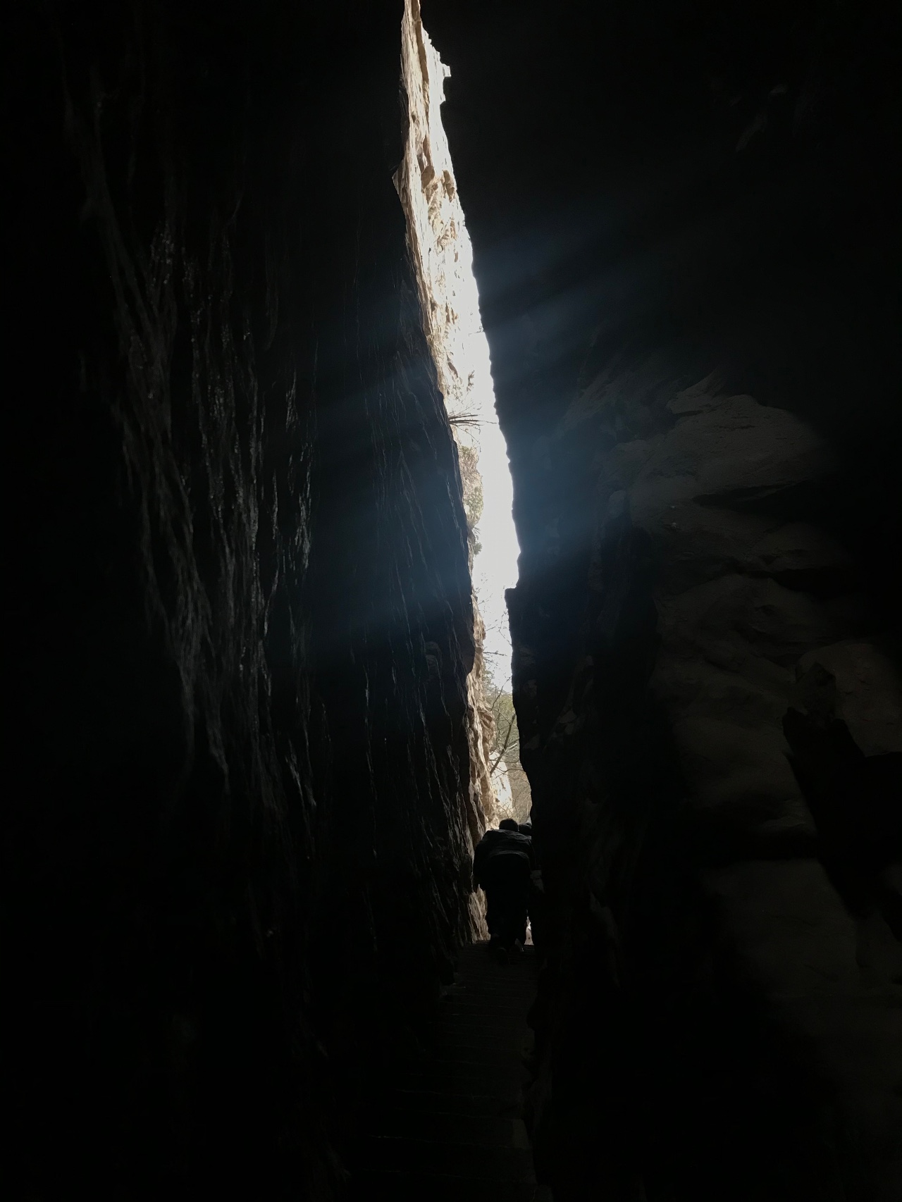 面對如此陡峭難行的山縫,同事們沒有選擇退縮,大家手扶石壁,小心翼翼的前行,步步踩實,不時傳來“小心碰頭,這里有突出石頭”、“沒有人落后邊吧”等關懷聲音,最終無人落隊,全體通過。