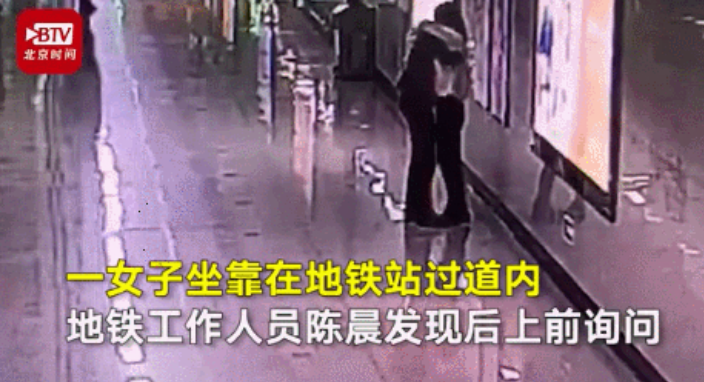 一女子蹲在地鐵站過道內低聲啜泣,
