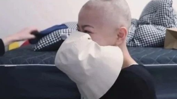 病床上的女孩兒帶著帽子默默哭泣,